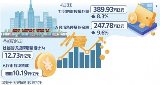 数据显示,4月末,社会融资规模存量389.93万亿元,同比增长8.3%,同经济增长和价格水平预期目标基本匹配;人民币各项贷款余额247.78万亿元,同比增长9.6%,增速与上月末持平。